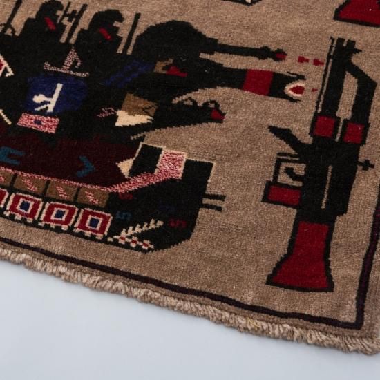 マシンガンやタンク、ヘリコプター、手りゅう弾などの兵器が描かれている”アフガン・ウォーラグ”は、ソ連のアフガニスタン侵攻(1978年-1989年)をきっかけに始まったと言われる戦争のモチーフを取り入れたラグマット。多くの部族が入り組むようにして暮らしている中東の一般的の家庭で、さまざまな出来事を記憶とともに後世へ伝えるためだったり、織り手それぞれの思いや願いを込めて手織りで織られた絨毯です。