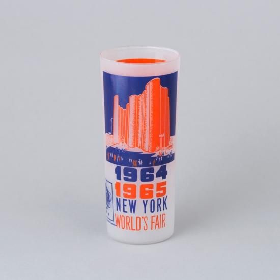 1964年から1965年にかけてアメリカ合衆国ニューヨークのフラッシング・メドウズ・パークで開催された「ニューヨーク万国博覧会」のスーベニアグラス。フロスト仕上げのベースに今も現存する「New York Hall of Science(NYSCI)」の建物が描かれています。