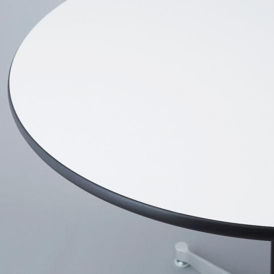 直径905mmの使い勝手の良いサイズ感、天板はホワイトのメラミン化粧板ですので汚れに強く清潔にご使用頂けます。天板・ベース共に大変良いコンディションでオススメです。