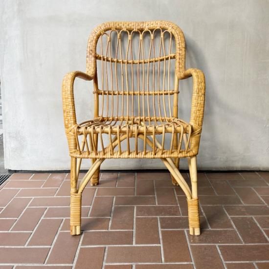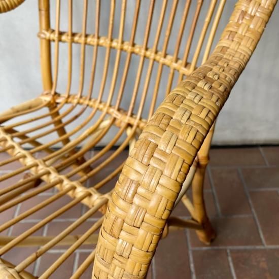 太さや形の違う藤(ラタン)で編み込まれて作られたヴィンテージのラウンジチェア。ラタンはインドネシア原産の天然素材で通気性が良く、日本の気候とも良く合う素材です。丁寧に組まれた座面はとても良い座り心地でリビングやベランダ、お庭が見えるお部屋にマッチすると思います。