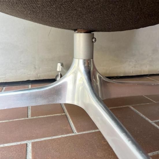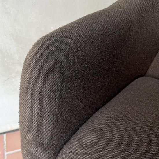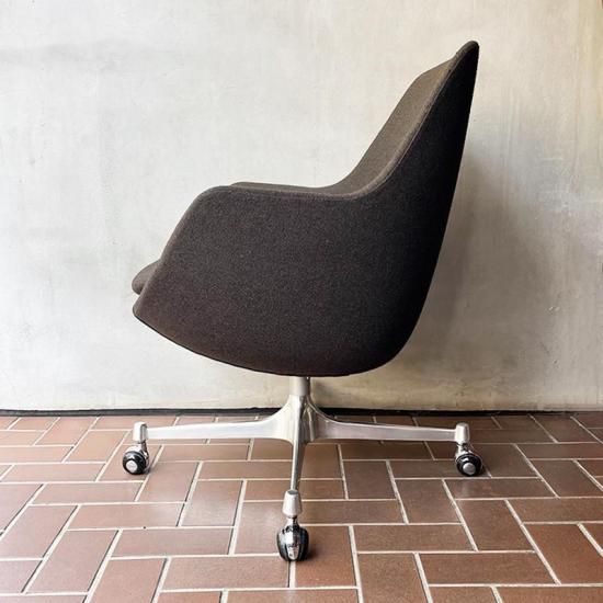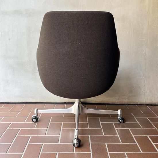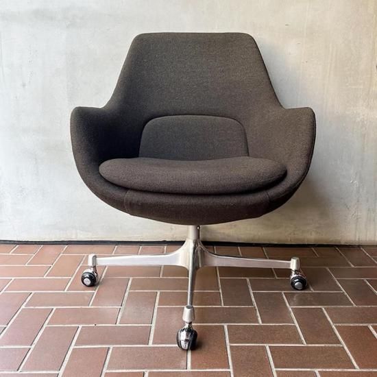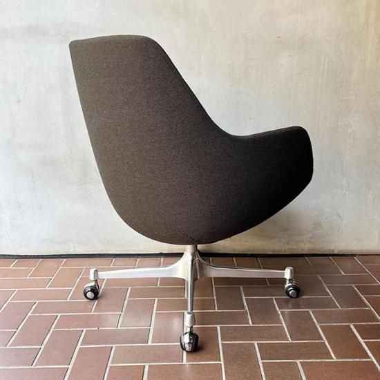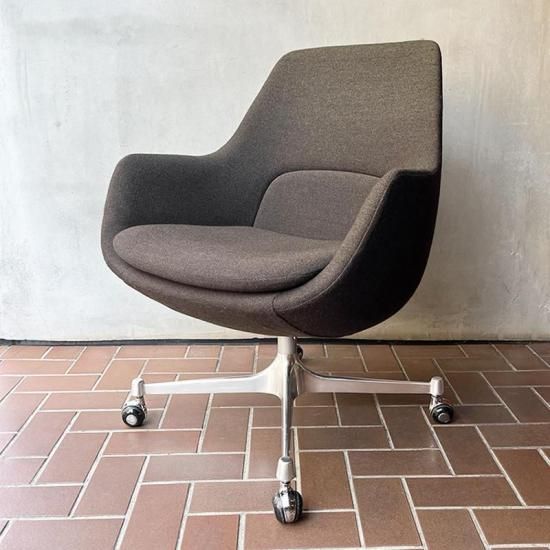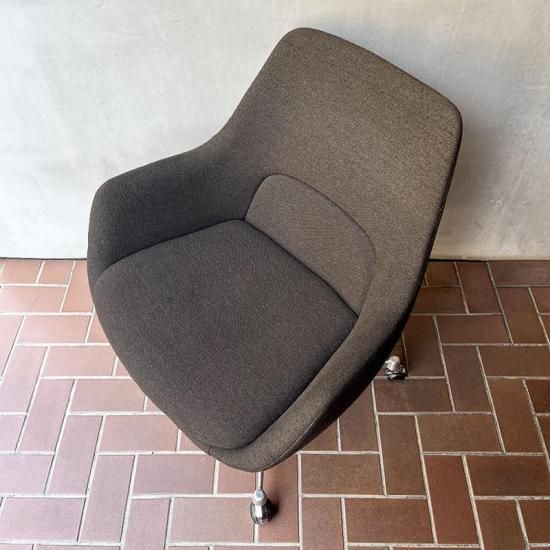 丸みを帯びたフォルムからも感じられる通り、しっかりと体を包み込んでくれるため、安心して身を任せられる快適な座り心地。ダークブラウンのファブリックで張られたぽってりとしたドロップ型のシートと、すこしエッジの効いたデザイン性のあるキャスターの組み合わせも絶妙です。