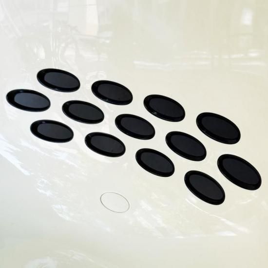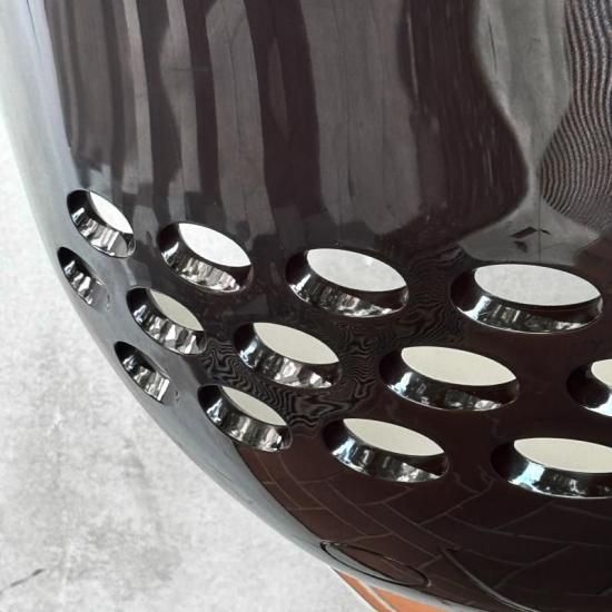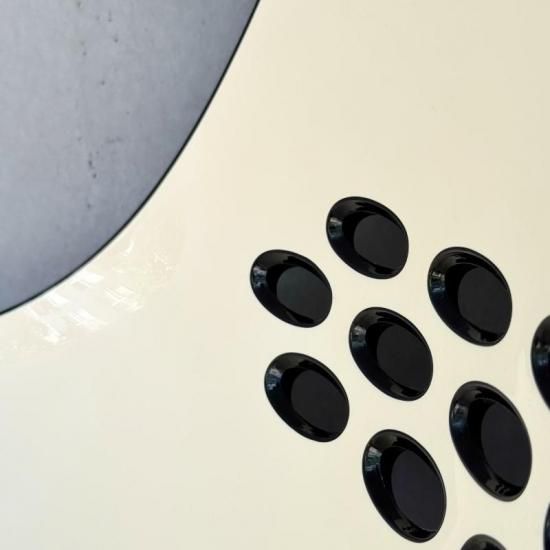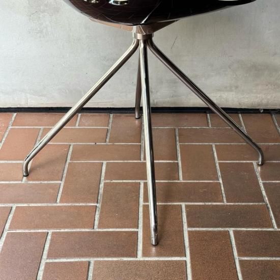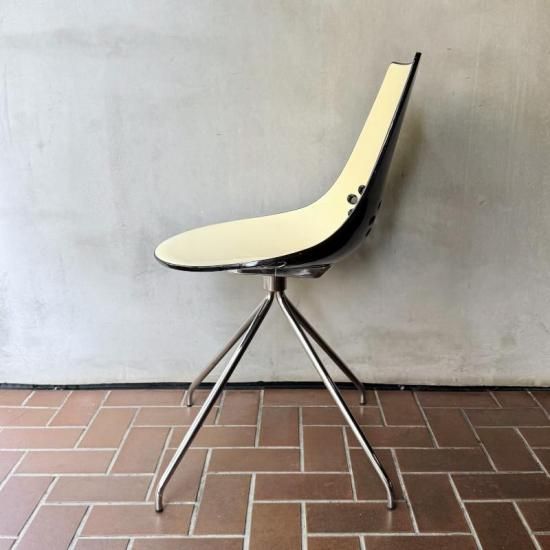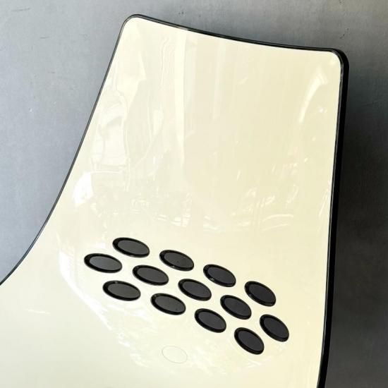 絶妙な色味をしたアイボリーとダークブラウンの2トーンで組み合わされた、光沢があり滑らかな表情の座面。その中央に空いている楕円の穴がエッジを効かせています。華奢なベースとの組み合わせも含め、どこかスペーシーな印象を受ける1脚です。