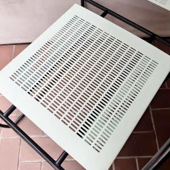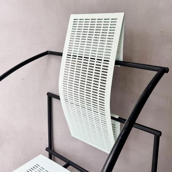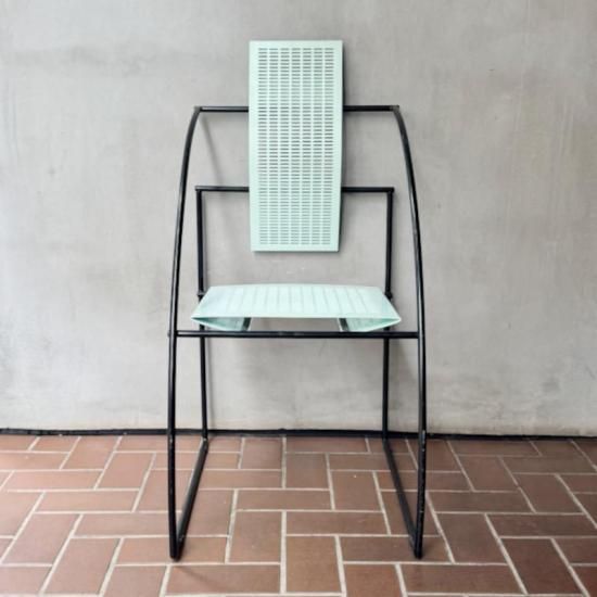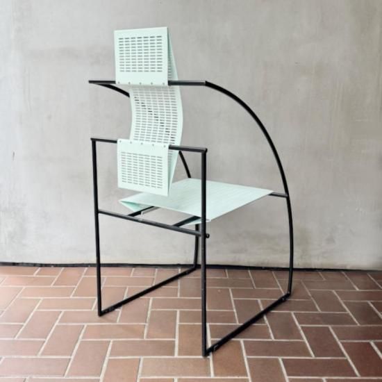 Manufactured by Alias, the Italian avant-garde furniture company also known for Giandomenico Belotti’s Spaghetti Chair and Botta’s Seconda, the Quinta combines sculptural presence with refined industrial design. Its striking composition pairs a bold black steel frame with a rare peppermint green perforated metal seat, accented by gracefully curved armrests.
