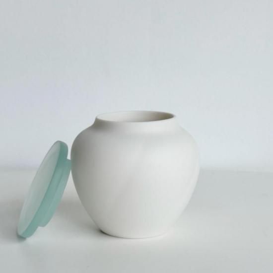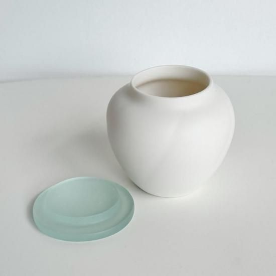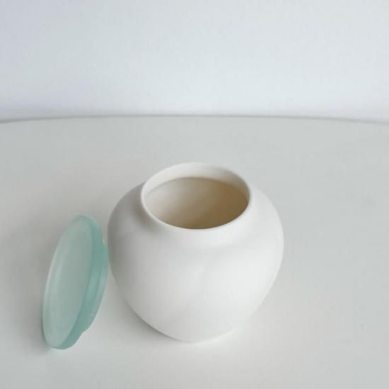 透明感のあるクリーム色の磁器と、やわらかな印象のガラスを組み合わせた、彼女を代表するシリーズです。