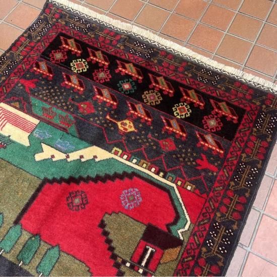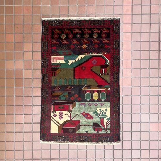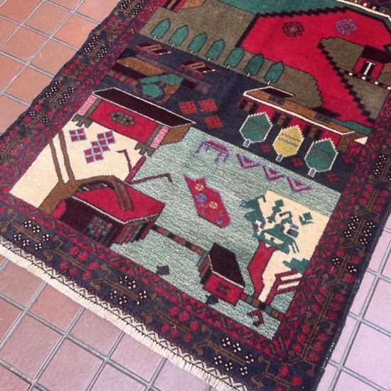 街のビル群やコンテナなどの近代的な風景をモチーフに取り込んだ”アフガン・アートラグ”。多くの部族が入り組むようにして暮らしている中東の一般的の家庭で、さまざまな出来事を記憶とともに後世へ伝えるためだったり、織り手それぞれの思いや願いを込めて手織りで織られた絨毯です。