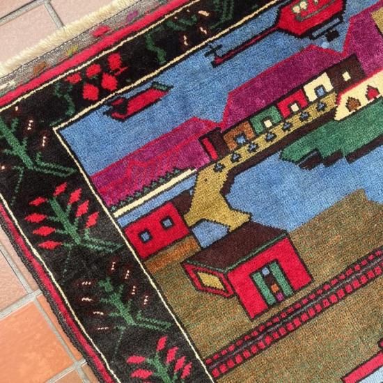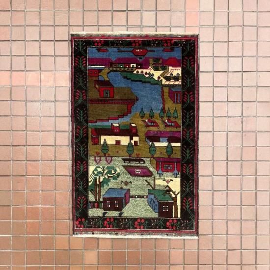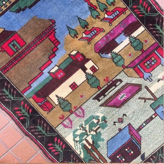 街のビル群やコンテナなどの近代的な風景をモチーフに取り込んだ”アフガン・アートラグ”。多くの部族が入り組むようにして暮らしている中東の一般的の家庭で、さまざまな出来事を記憶とともに後世へ伝えるためだったり、織り手それぞれの思いや願いを込めて手織りで織られた絨毯です。