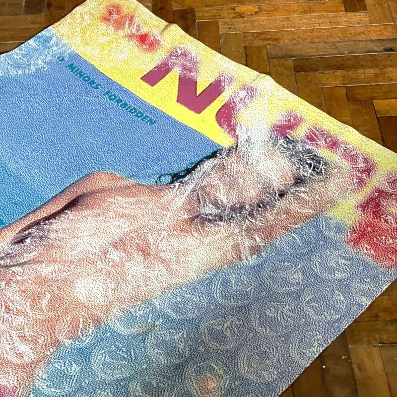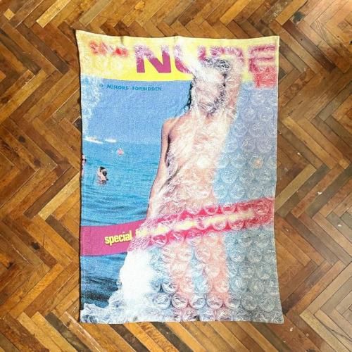 No.001:ビンテージのヌード雑誌をモチーフに、視覚の距離感と解像度に着目した作品。誰もが知るバブルラップを用い、6色の編み目によって構成された像に焦点を合わせることで、曖昧さと明晰さの境界を問いかける。近づくほどに失われ、離れるほどに立ち上がる全体像が、見るという行為そのものを再考させる。