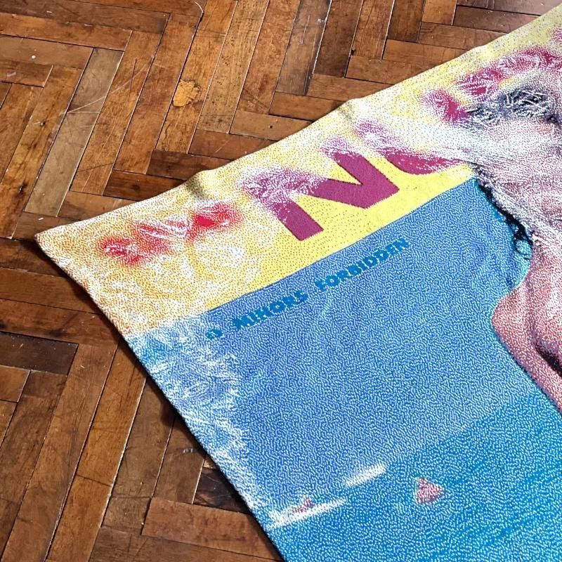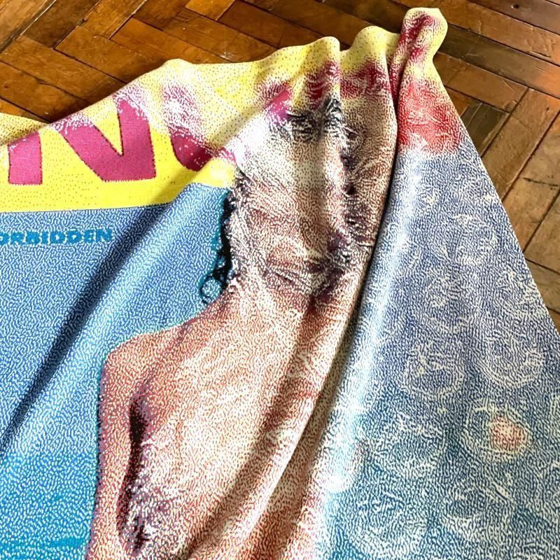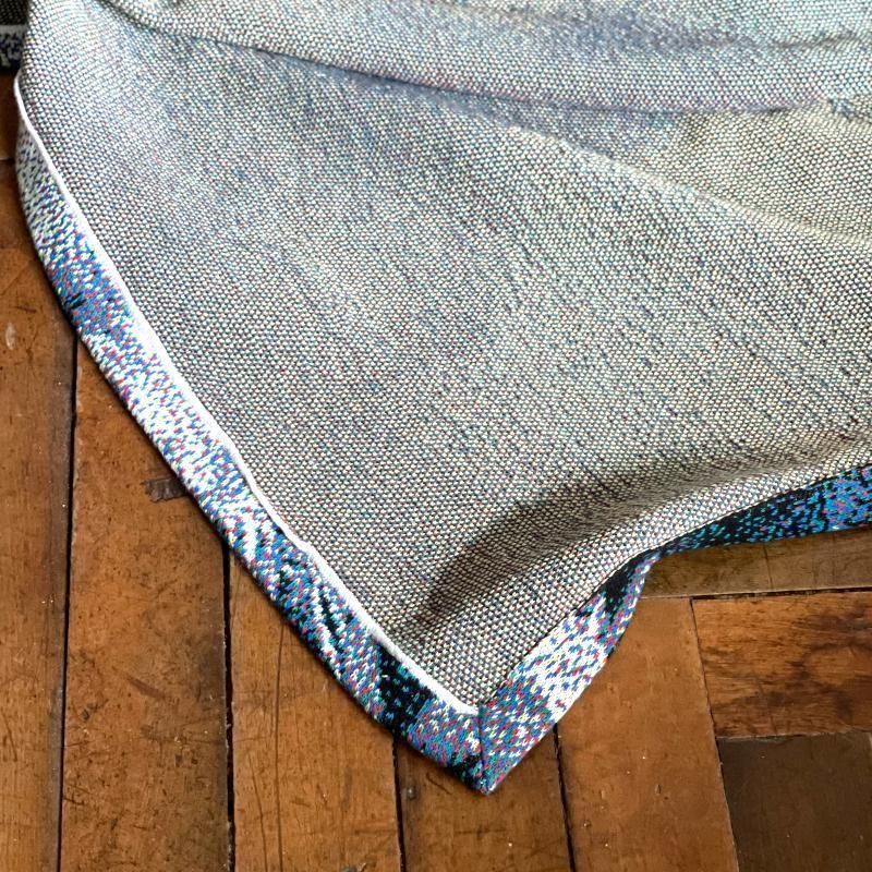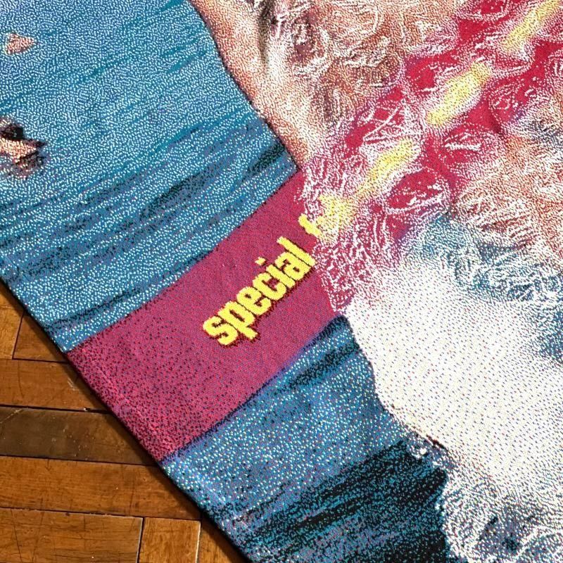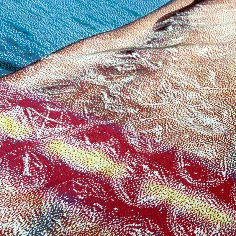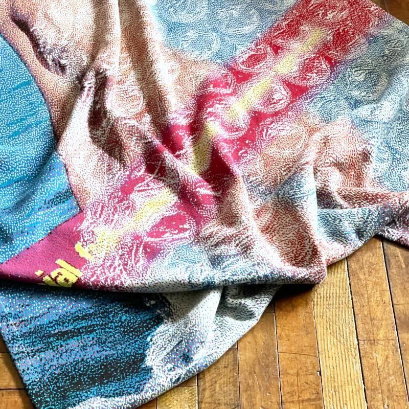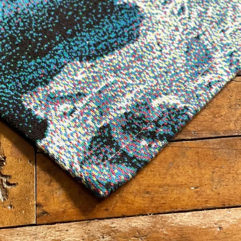 手に取って近くで見ると絵柄は認識できないのですが、距離を取るにつれて写真のようにはっきりと目に見えるようになるユニークな作り。ソファやベッドにすこし雑に掛かっているのも良さそうですし、そのまま壁に飾ってみるのもお勧めです。