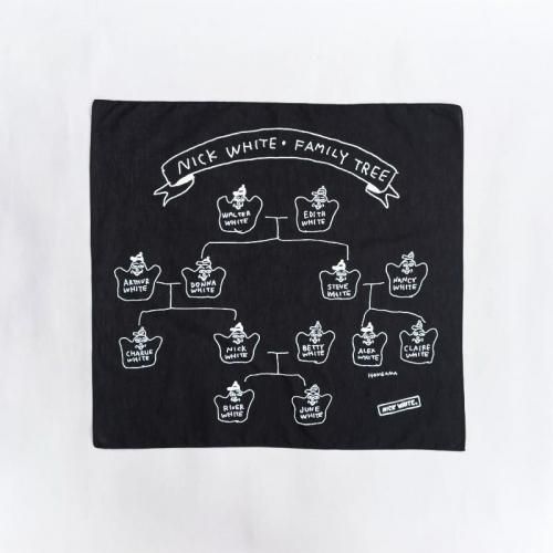 アーティスト・HONGAMA(ホンガマ)とNICK WHITE GALLERYが制作したコラボアイテム。今回の展覧会のために書き下ろした「NICK WHITE FAMILY TREE」をプリントしたバンダナです。