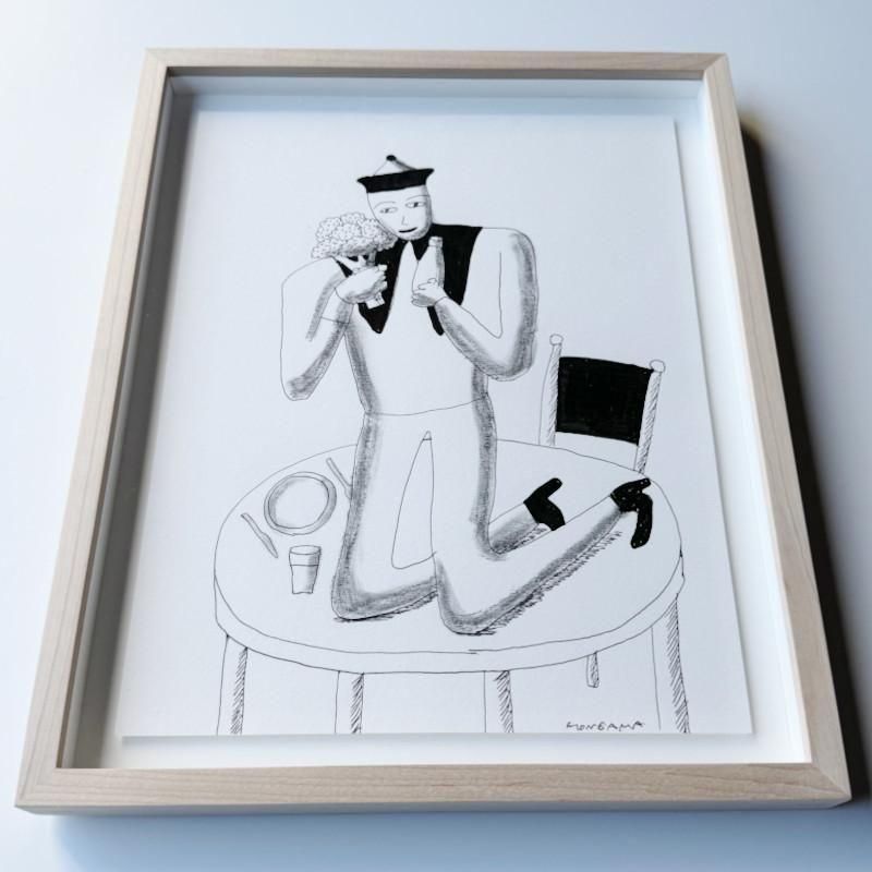 NICK WHITE にて開催されたHONGAMA SOLO EXHIBITION「バッド・ドリームス」 のために制作された、モノクロドローイング作品。本作は額装済みで、作品としてすぐに飾っていただける仕様となっています。