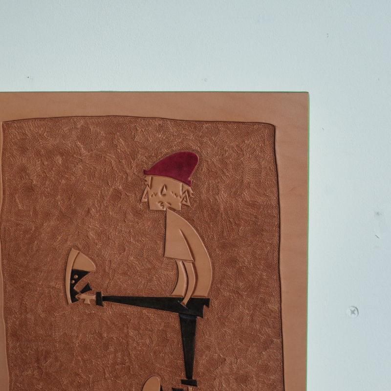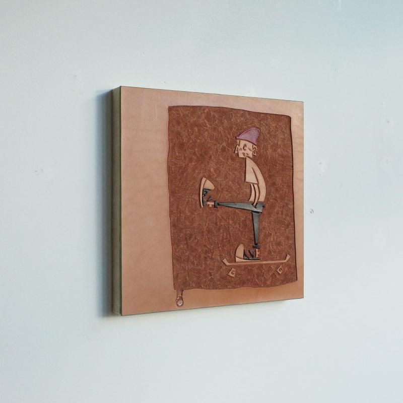 ストリートカルチャーから影響を受けた彼独自のイラストを、革の彫刻とも称されるカービングの技法を用いて制作されたスズキシノブの作品「CAUGHT BY YOU #2」。対象者に見られている自分も対象者。お互いに見つめ合っている瞬間、そこにあるものは愛であってほしい。実物を近くで見れば見るほど、制作に費やした時間や労力から、そこに宿る彼の想いを感じることのできる作品です。