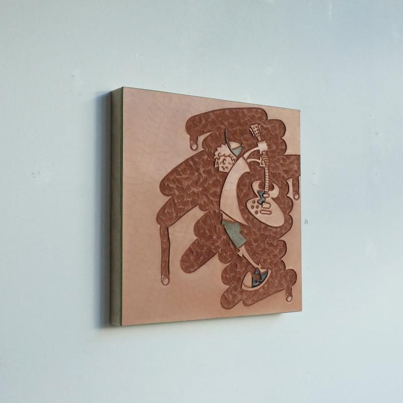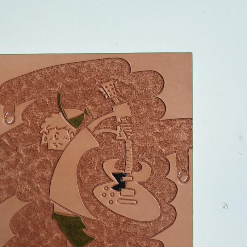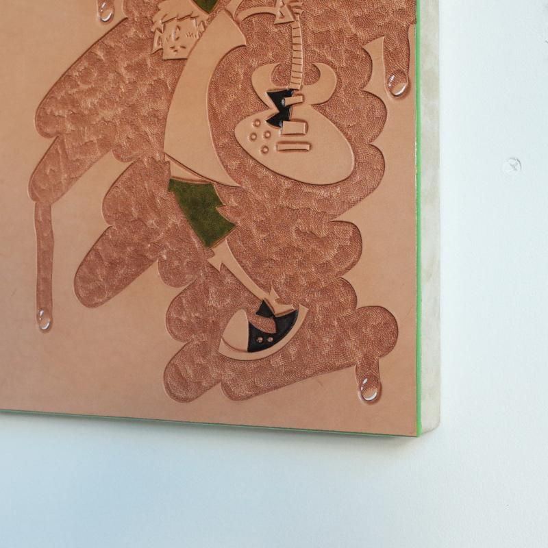 ストリートカルチャーから影響を受けた彼独自のイラストを、革の彫刻とも称されるカービングの技法を用いて制作されたスズキシノブの作品「CAUGHT BY YOU #4」。対象者に見られている自分も対象者。お互いに見つめ合っている瞬間、そこにあるものは愛であってほしい。実物を近くで見れば見るほど、制作に費やした時間や労力から、そこに宿る彼の想いを感じることのできる作品です。