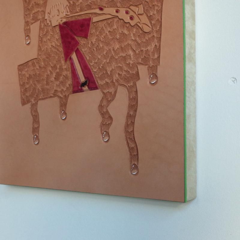 ストリートカルチャーから影響を受けた彼独自のイラストを、革の彫刻とも称されるカービングの技法を用いて制作されたスズキシノブの作品「CAUGHT BY YOU #6」。対象者に見られている自分も対象者。お互いに見つめ合っている瞬間、そこにあるものは愛であってほしい。実物を近くで見れば見るほど、制作に費やした時間や労力から、そこに宿る彼の想いを感じることのできる作品です。