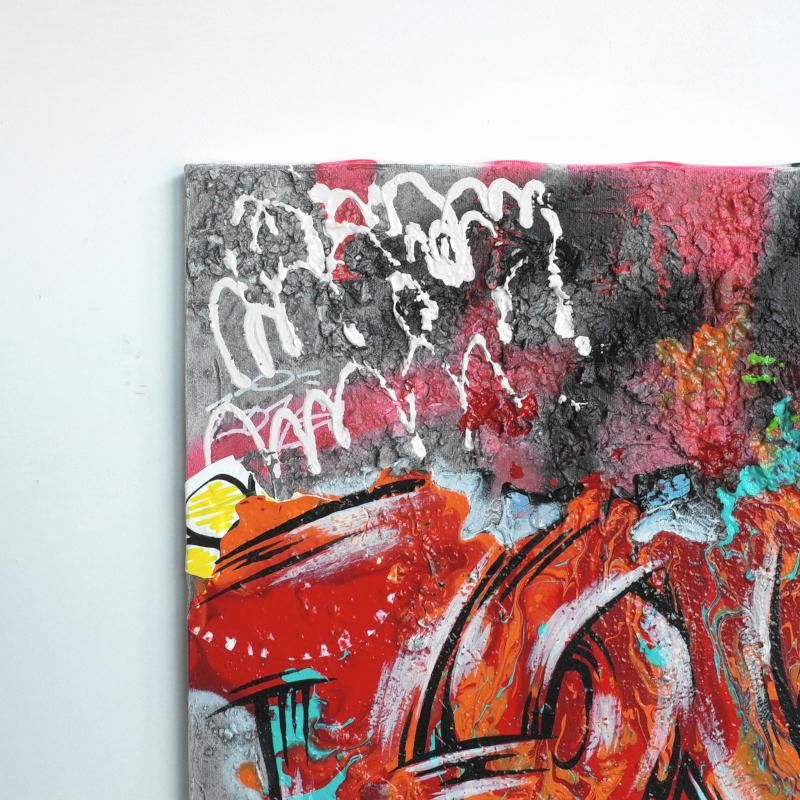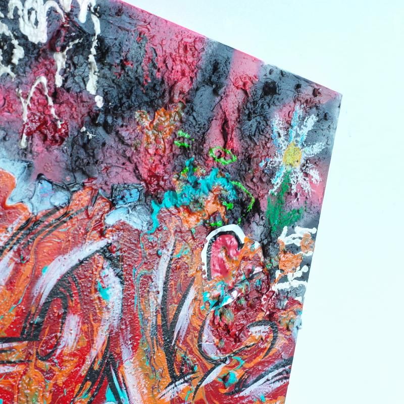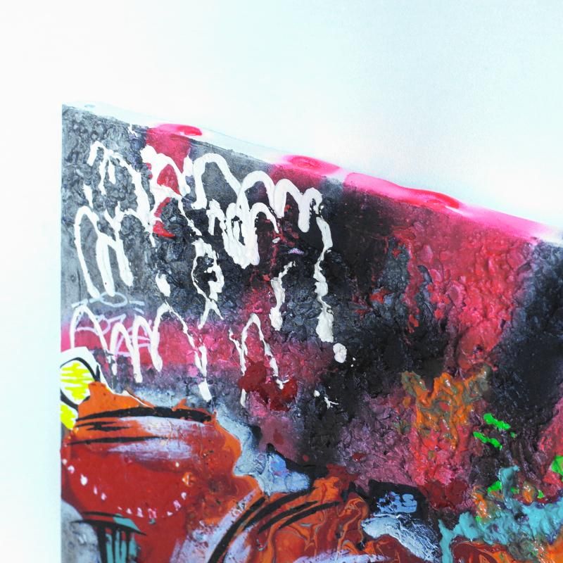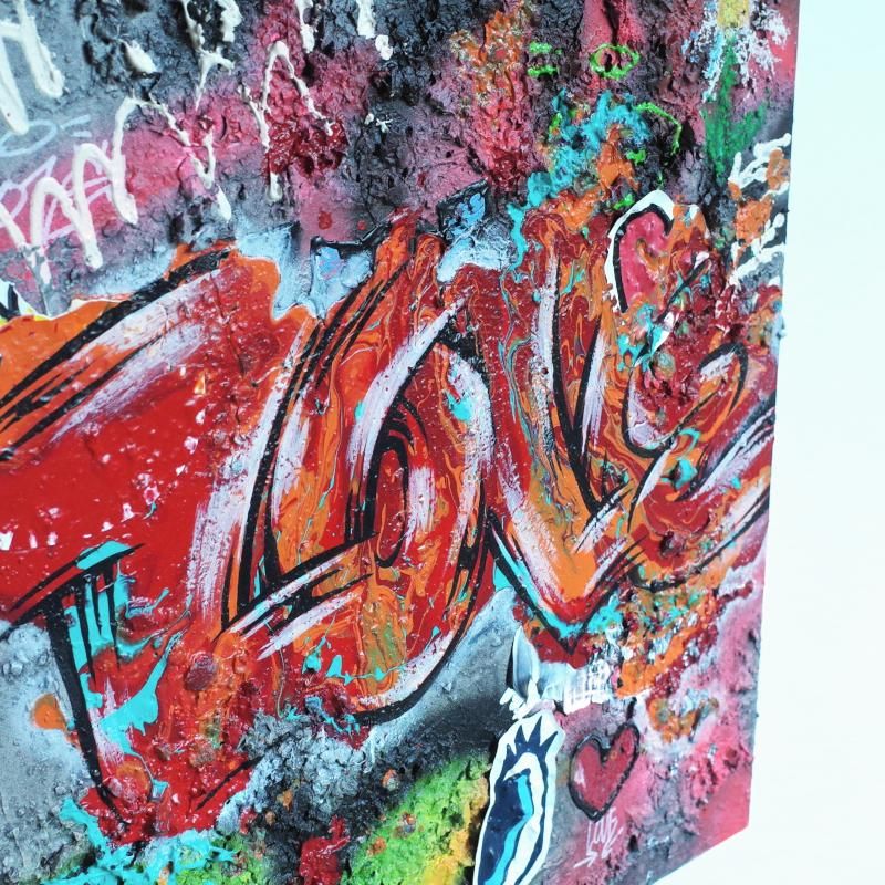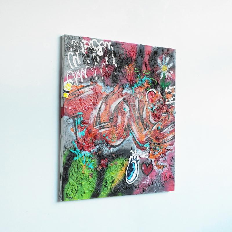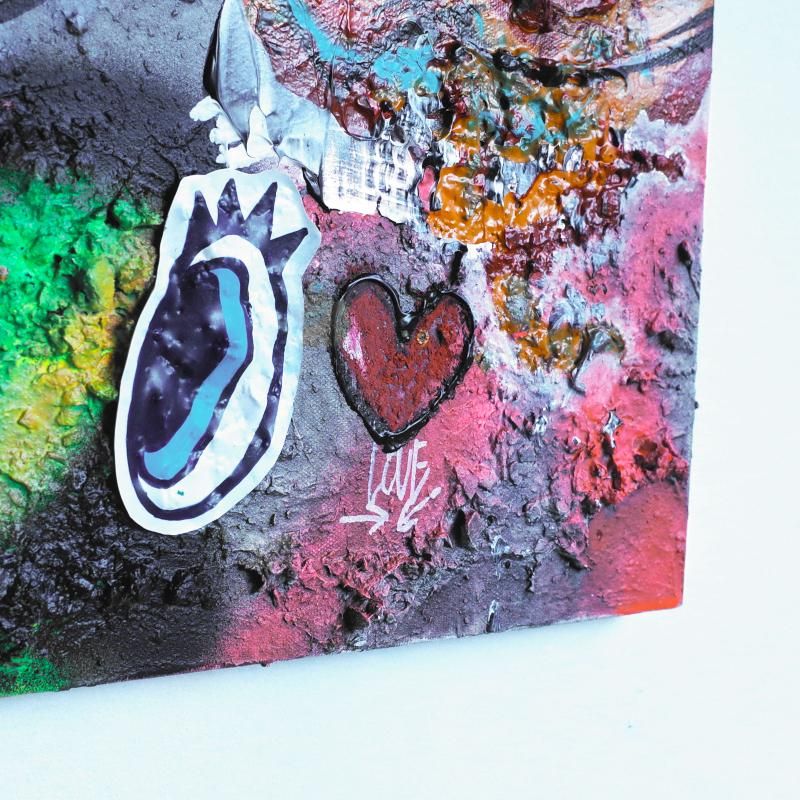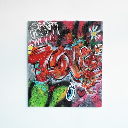グラフィティやダンスなどのストリートカルチャーから受けた影響やインスピレーションを、太古の昔から存在する陶器や石という素材で表現したキャンバス作品「LOVE THE FLOWER」。伝統的である陶の技法から解き放たれた彼独自のカルチャーを生み出しています。既成概念に捉われない想いの詰まった作品です。