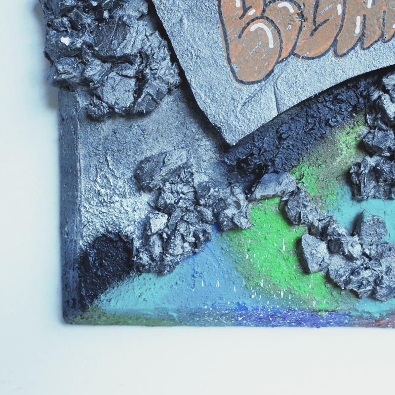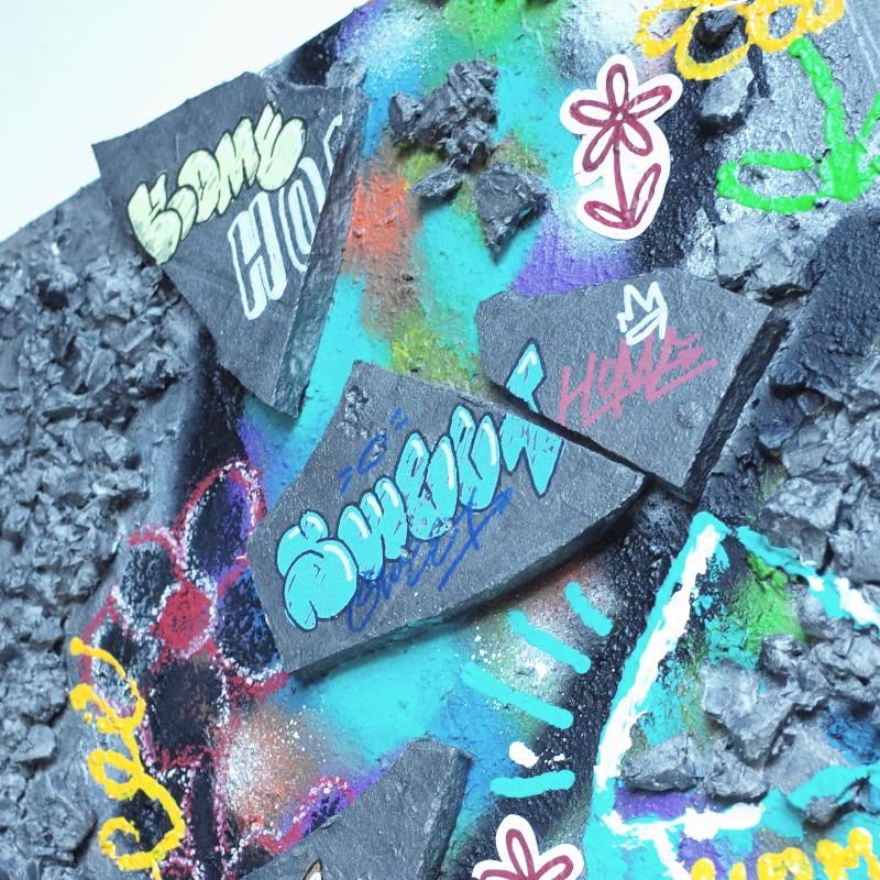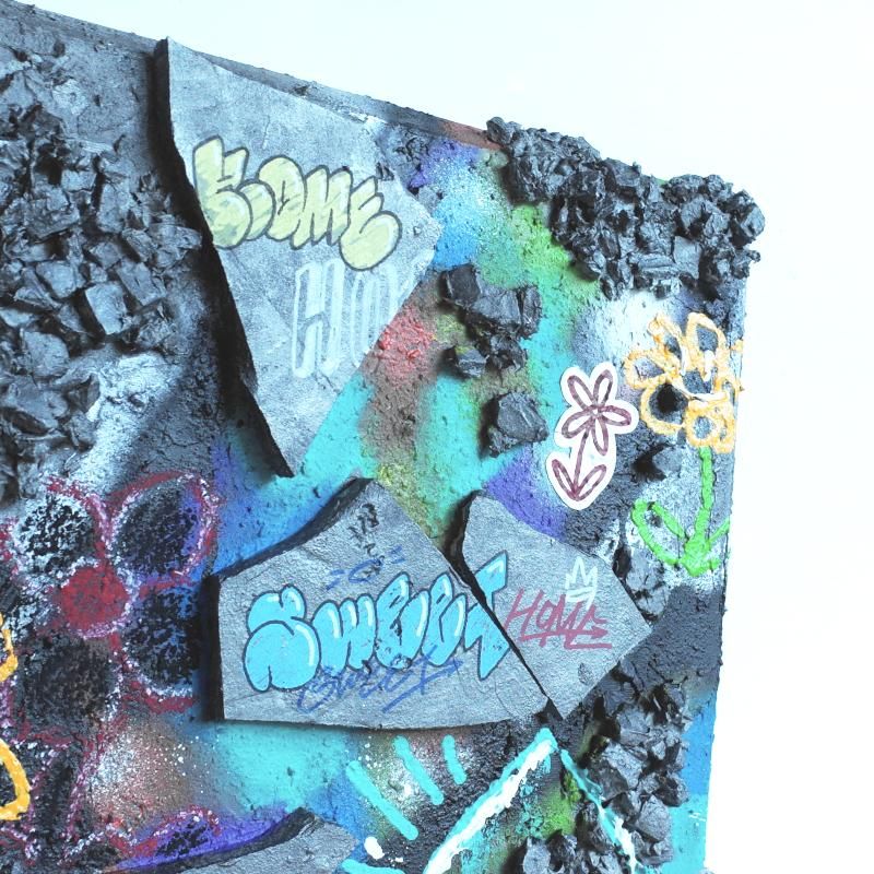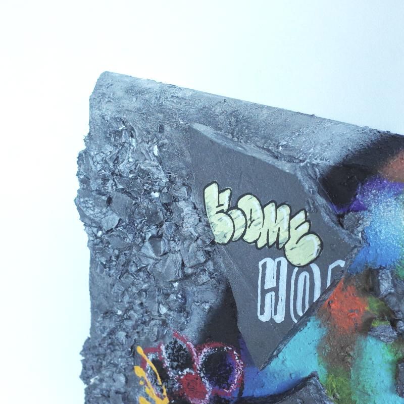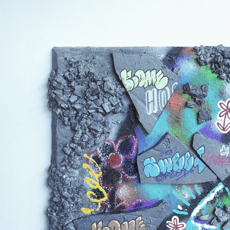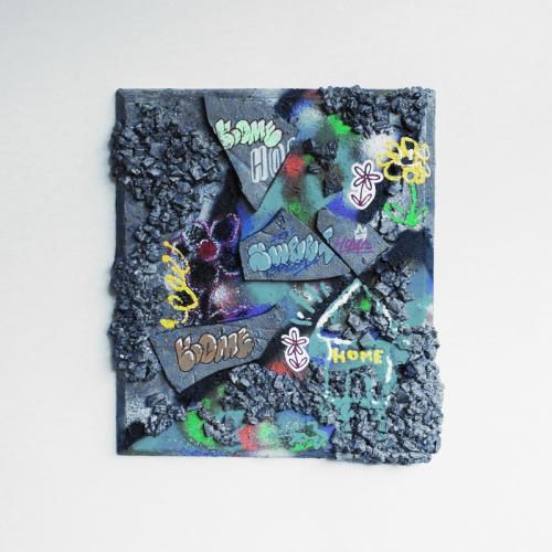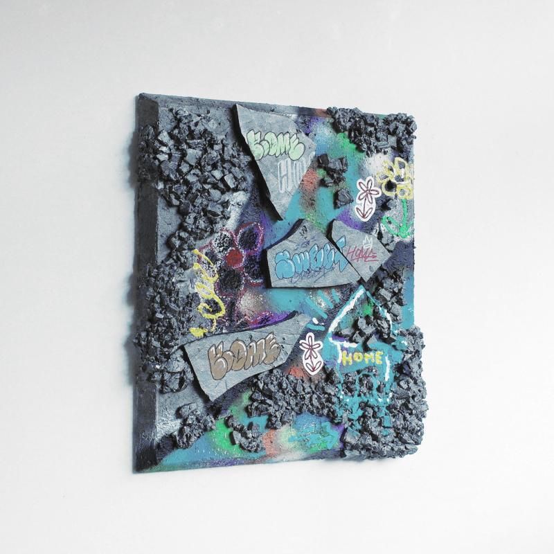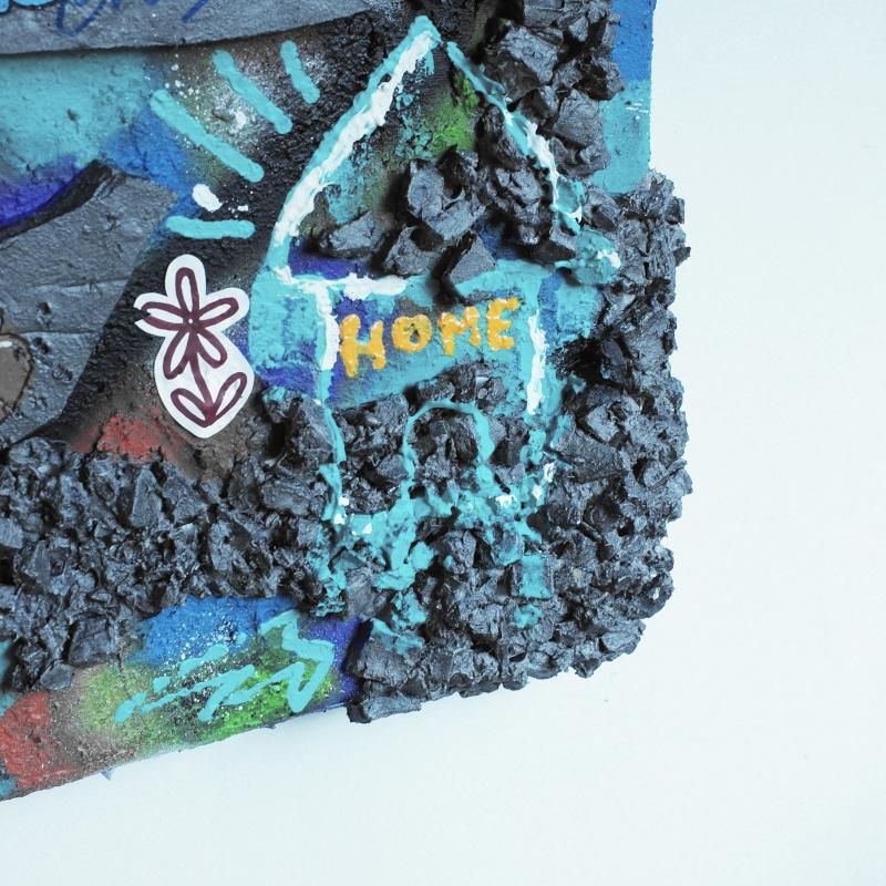 グラフィティやダンスなどのストリートカルチャーから受けた影響やインスピレーションを、太古の昔から存在する陶器や石という素材で表現したキャンバス作品「HOME SWEET HOME」。伝統的である陶の技法から解き放たれた彼独自のカルチャーを生み出しています。既成概念に捉われない想いの詰まった作品です。