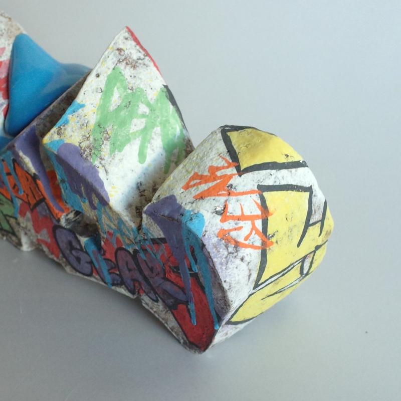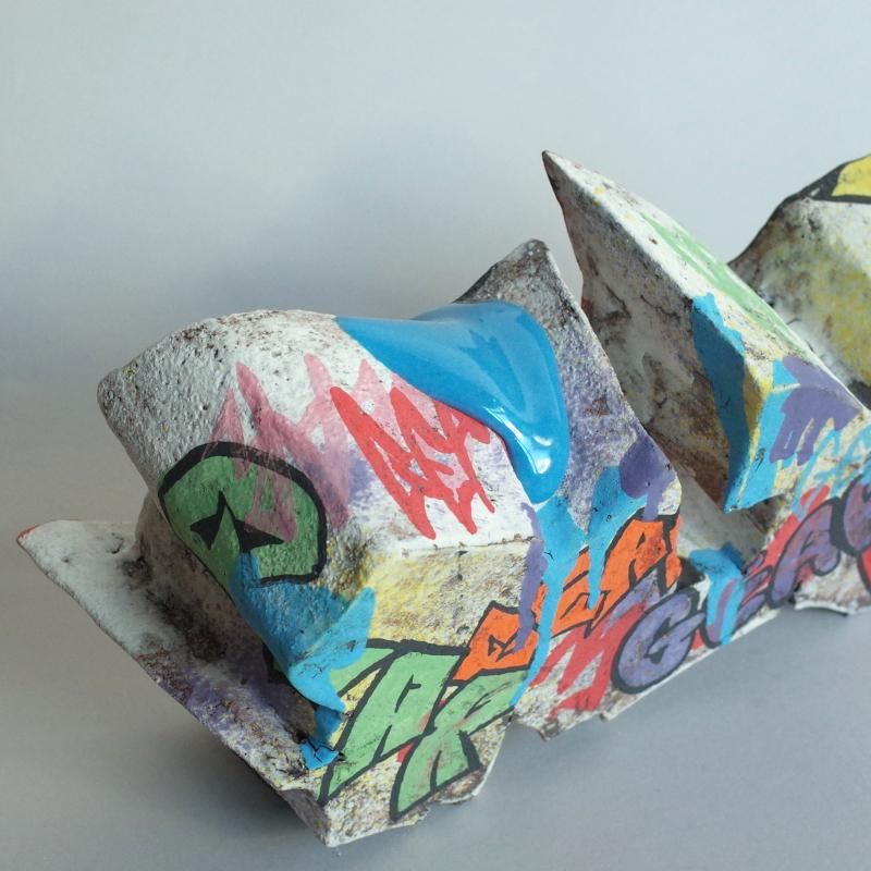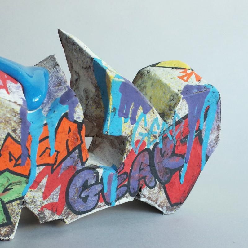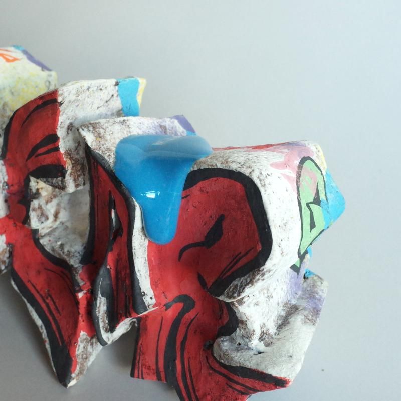 砥部焼の産地である愛媛県出身。幼少期より身近に陶芸を感じながらも、グラフィティやダンスなどのストリートカルチャーに関心を持つ。「陶」という不変性を持つ素材を用いて、ストリートカルチャー固有の身体的エネルギーや複層的なレイヤーを表現する。そして、複雑に変容する困難な時代の痕跡を作品として提示する。