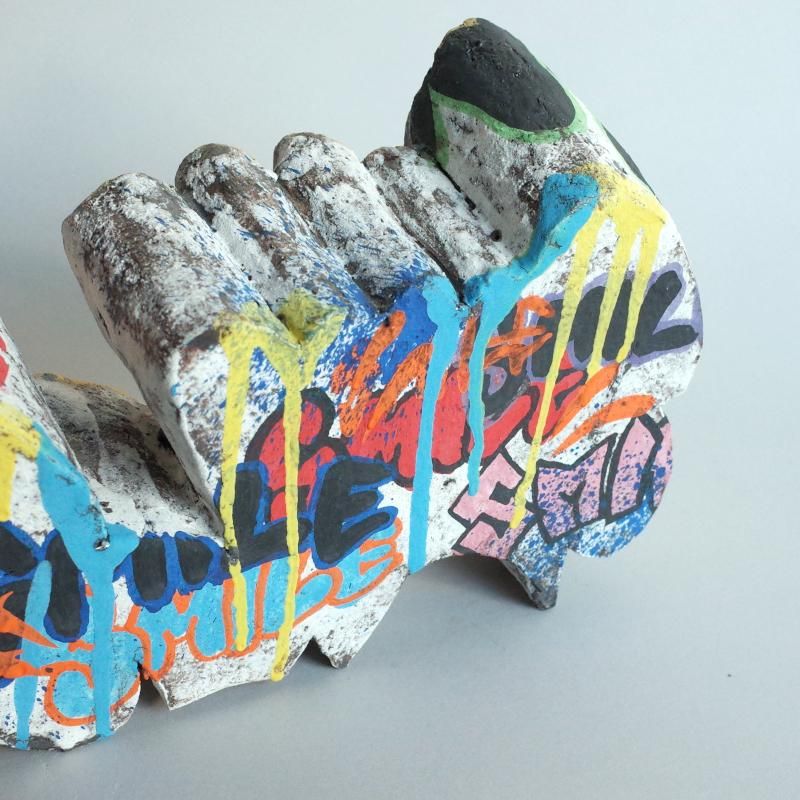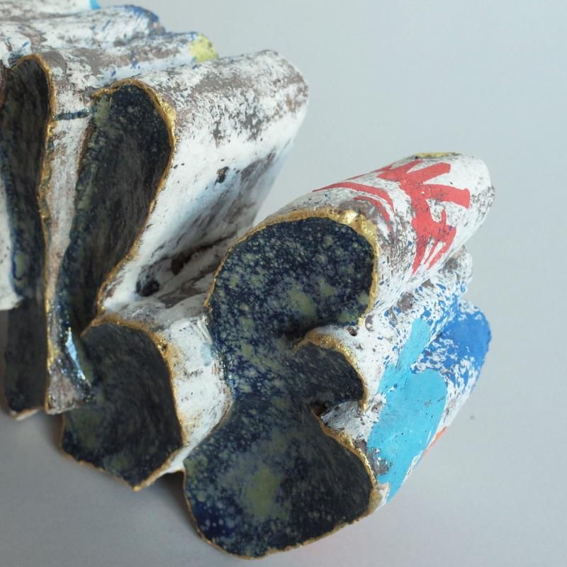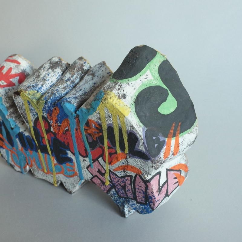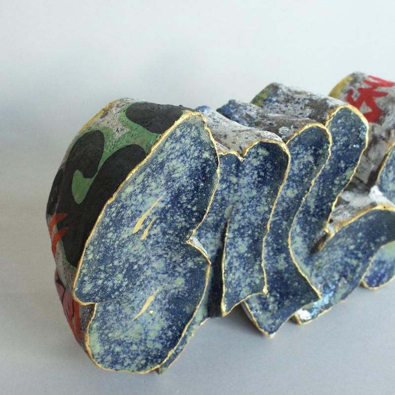 砥部焼の産地である愛媛県出身。幼少期より身近に陶芸を感じながらも、グラフィティやダンスなどのストリートカルチャーに関心を持つ。「陶」という不変性を持つ素材を用いて、ストリートカルチャー固有の身体的エネルギーや複層的なレイヤーを表現する。そして、複雑に変容する困難な時代の痕跡を作品として提示する。