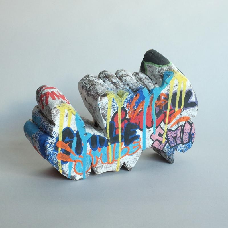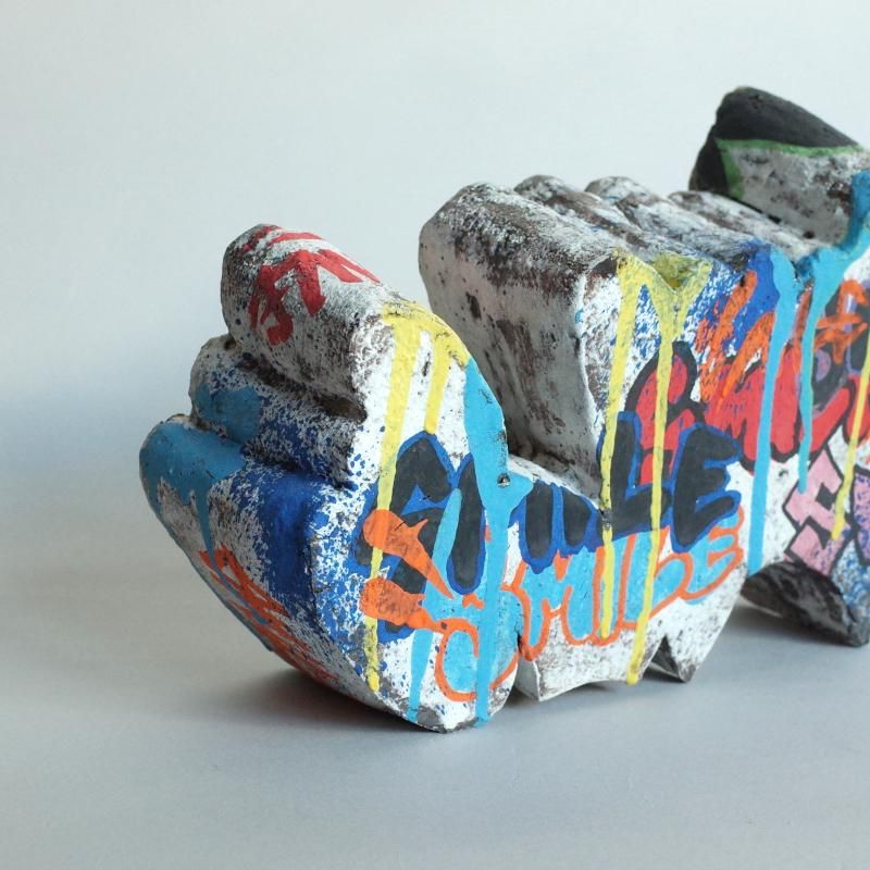 グラフィティやダンスなどのストリートカルチャーから受けた影響やインスピレーションを、太古の昔から存在する陶という素材で表現した彼を代表する作品「SMILE」。伝統的である陶の技法から解き放たれた彼独自のカルチャーを生み出しています。既成概念に捉われない想いの詰まった作品です。