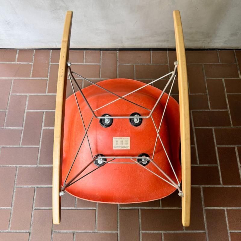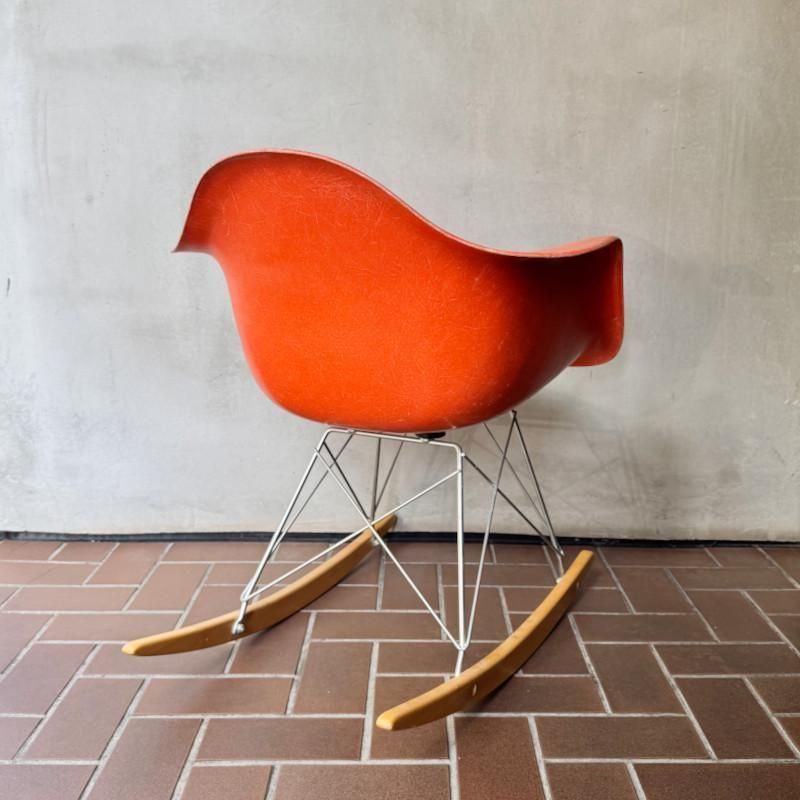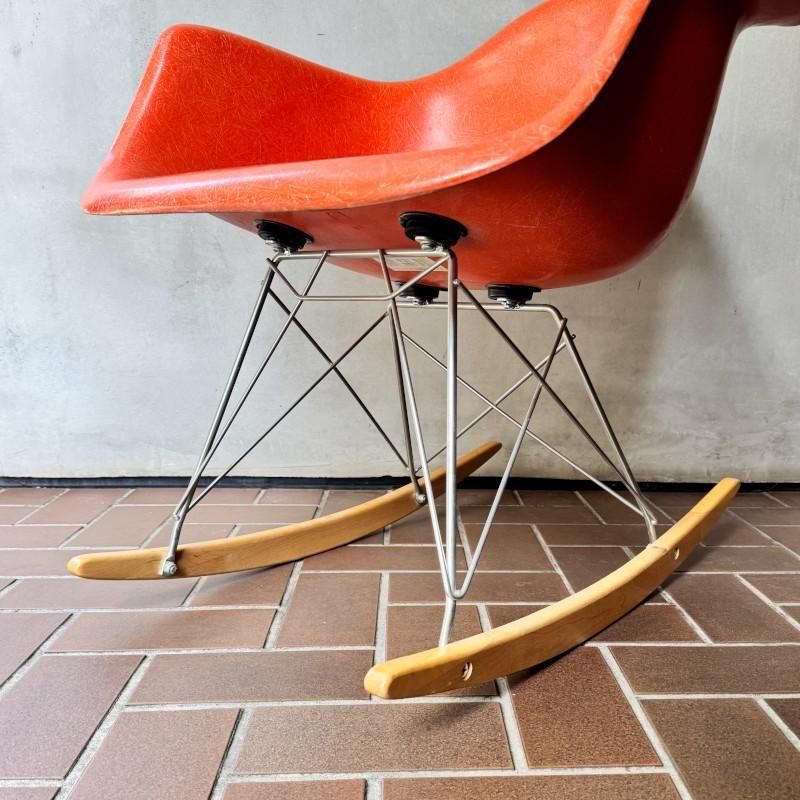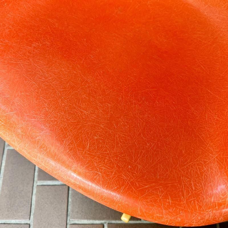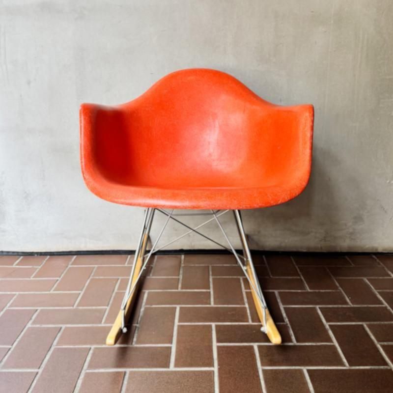 こちらは、1960年代後半〜70年代頃に製造されたヴィンテージFRPアームシェルに、米国Modernica(モダニカ)社製のロッカーベースを組み合わせた一脚。カラーはミッドセンチュリー期に人気を博したレッドオレンジ。