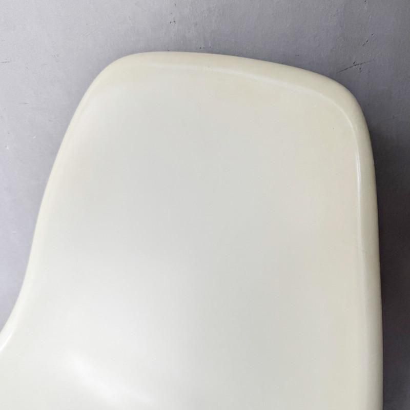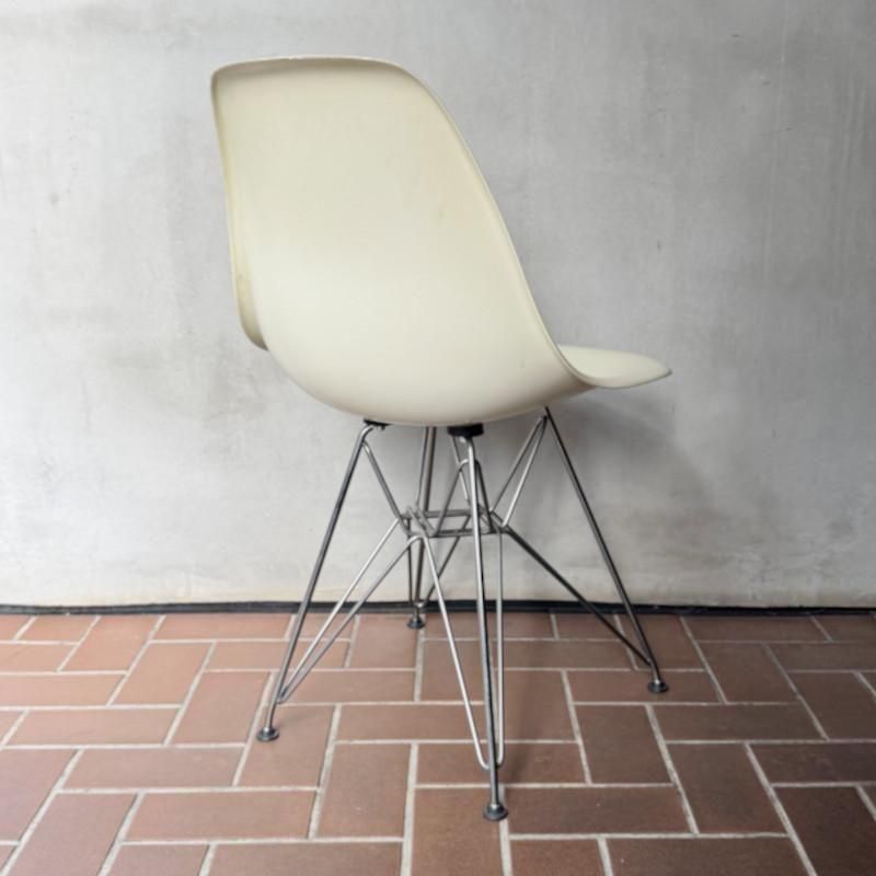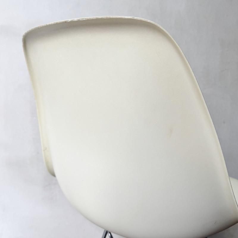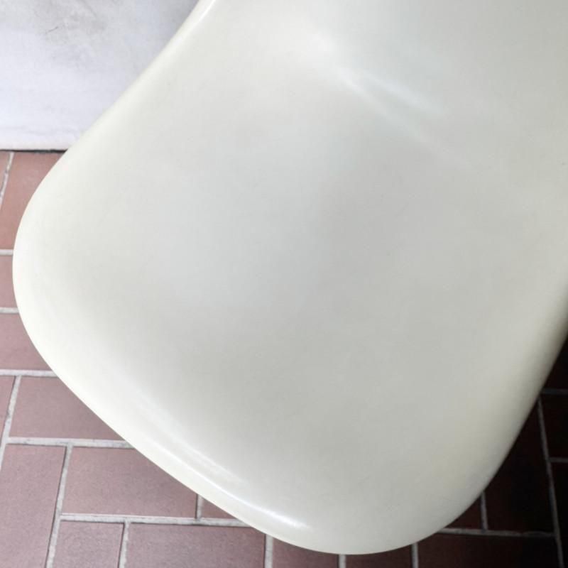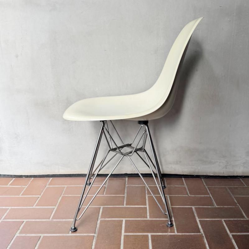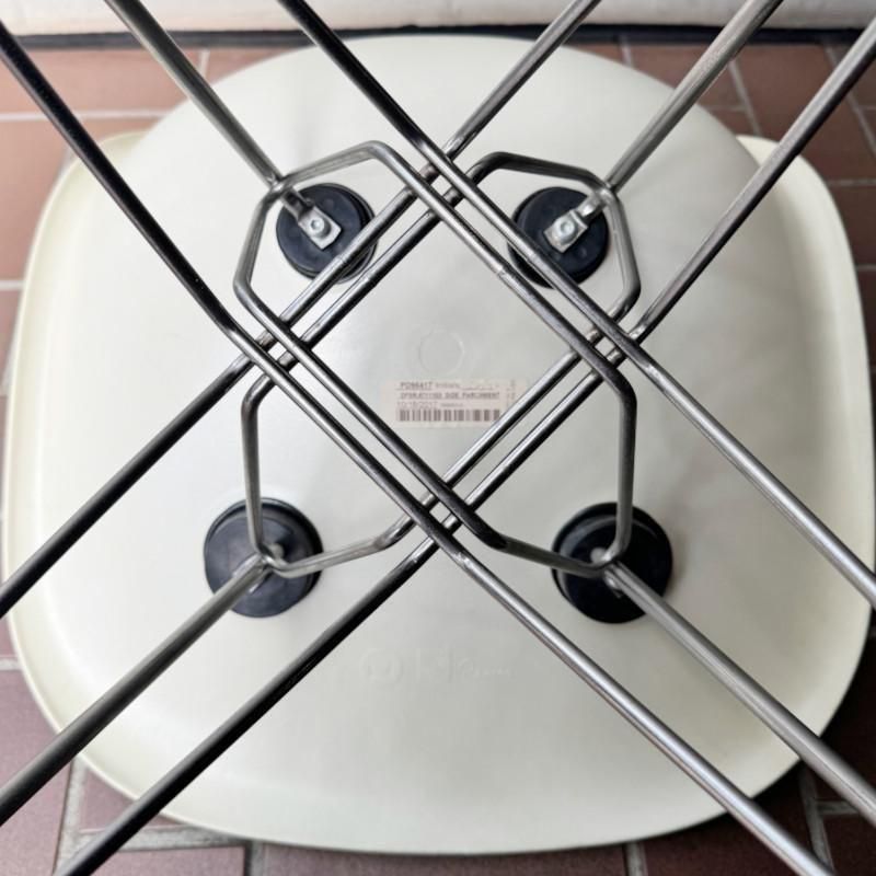 こちらは美しいサーフェイスを持つハーマンミラー純正グラスファイバーシェルとエッフェルベースを組み合わせた代表的なモデル「DSR」。DSRとは Dining Height / Side Chair / Rod Wire Base の略称で、その名の通りダイニングテーブルやワークデスクに最適なサイズ感を備えています。
